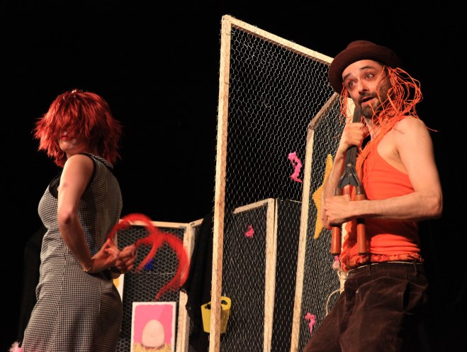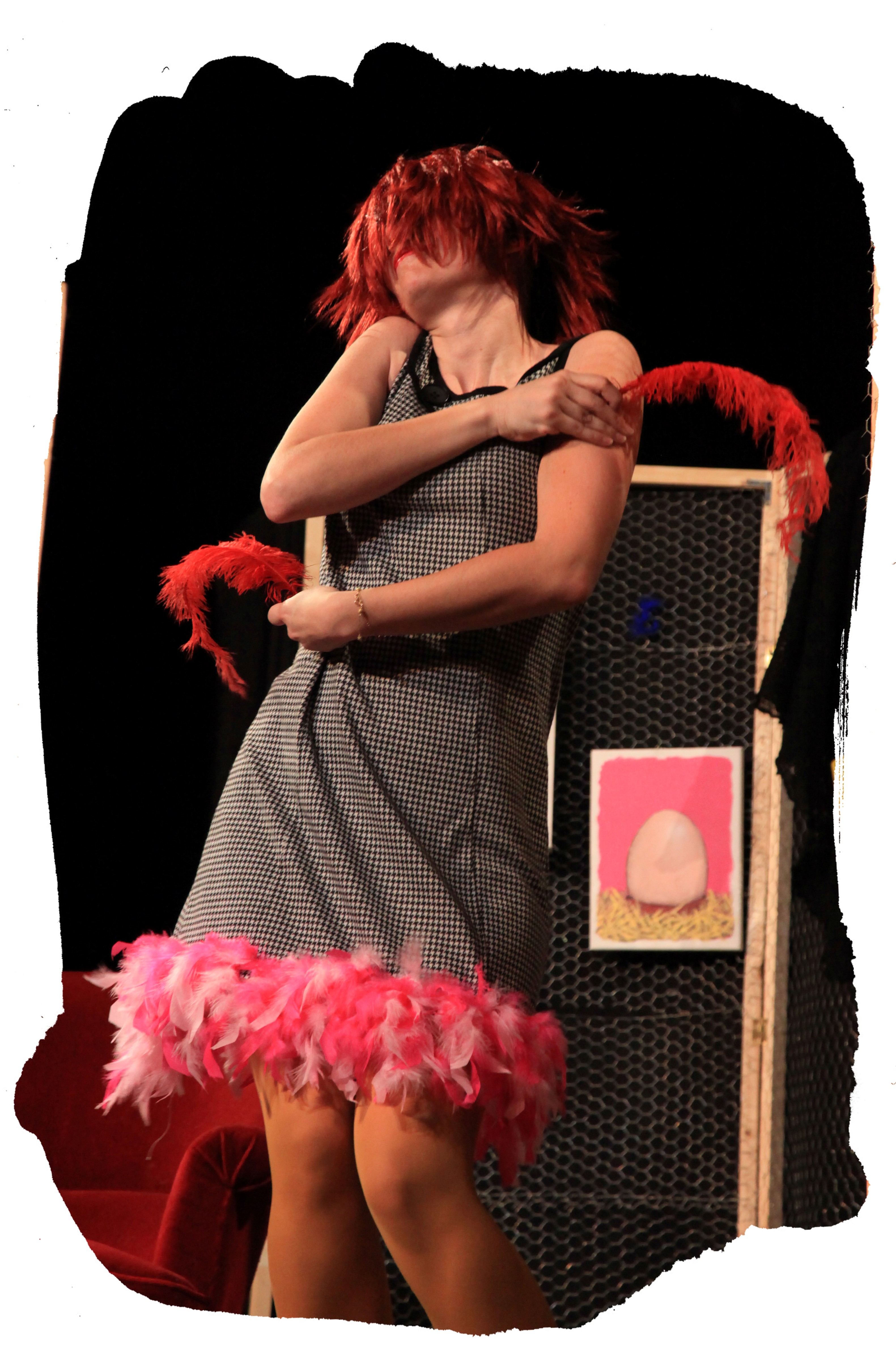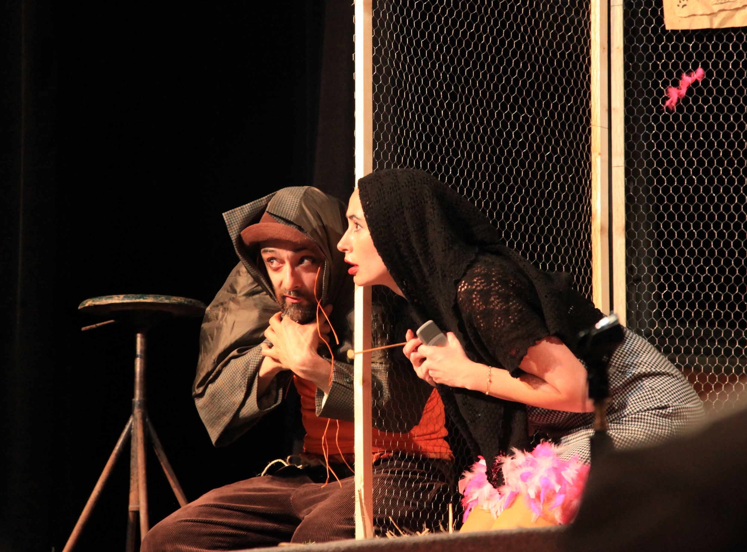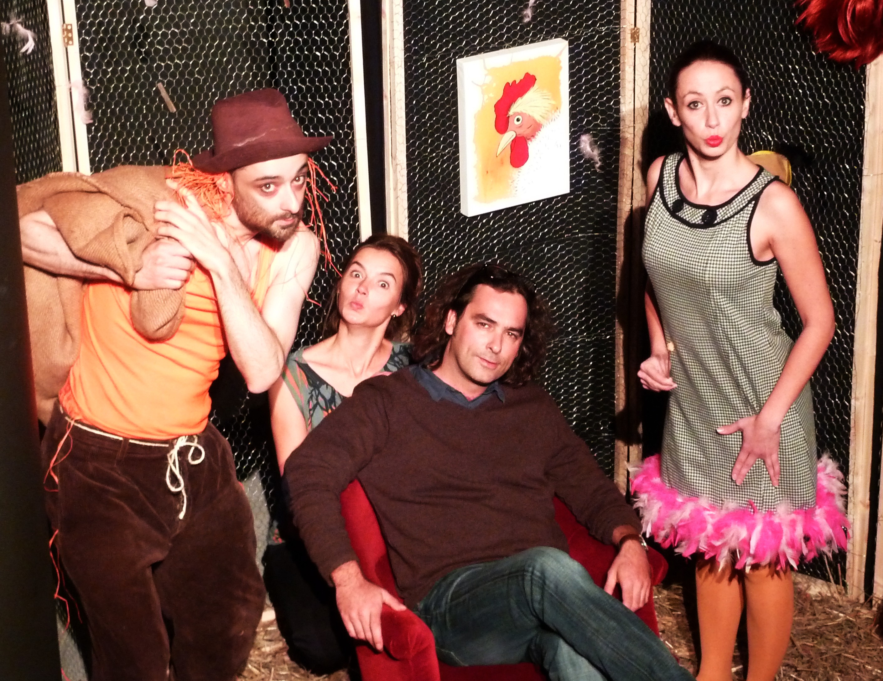 dont la rencontre est improbable : le renard, rusé, erre en baroudeur et séducteur négligé et la poule parade en parfaite coquette. Un troisième personnage ponctue l’échange entre les deux protagonistes : la poulette. Elle intervient ponctuellement mi-écervelée, mi-séductrice et quelque peu frivole, contribuant ainsi à faire déraper joyeusement le spectacle dans des situations inattendues. Une même comédienne joue la poule et la poulette, réalisant ses changements de rôle à vue, façon de rappeler que nous sommes bel et bien au théâtre, que le jeu permet l’illusion, que tout peut arriver.