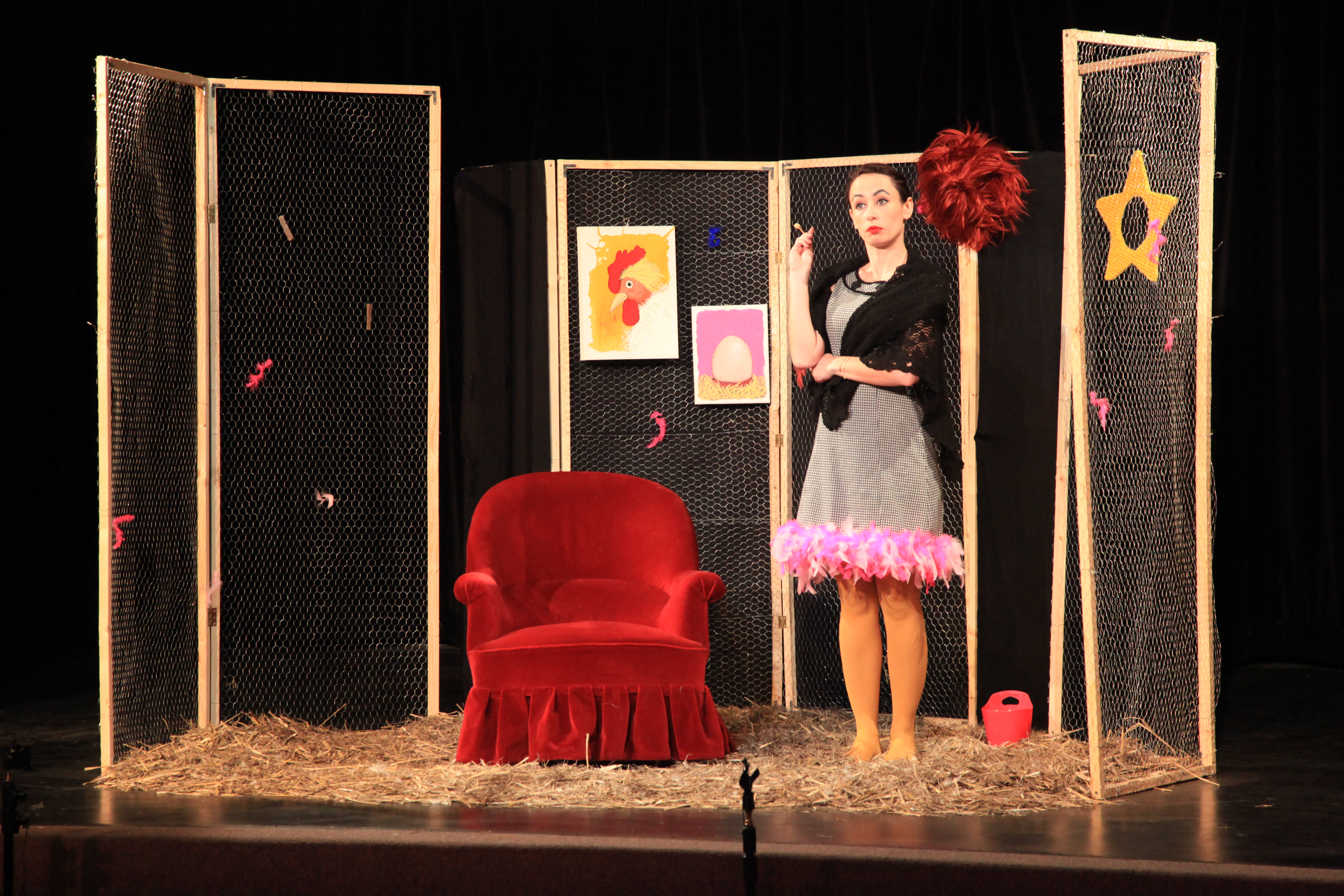 L’espace a été conçu pour renforcer le contraste entre les deux personnages principaux. Les spectateurs encerclent la poule avec le renard qui peut surgir de n’importe où. La poule, elle, est centrale, coincée dans son poulailler bien rangé.